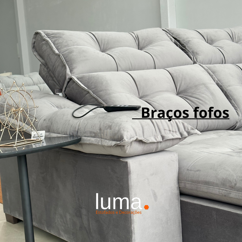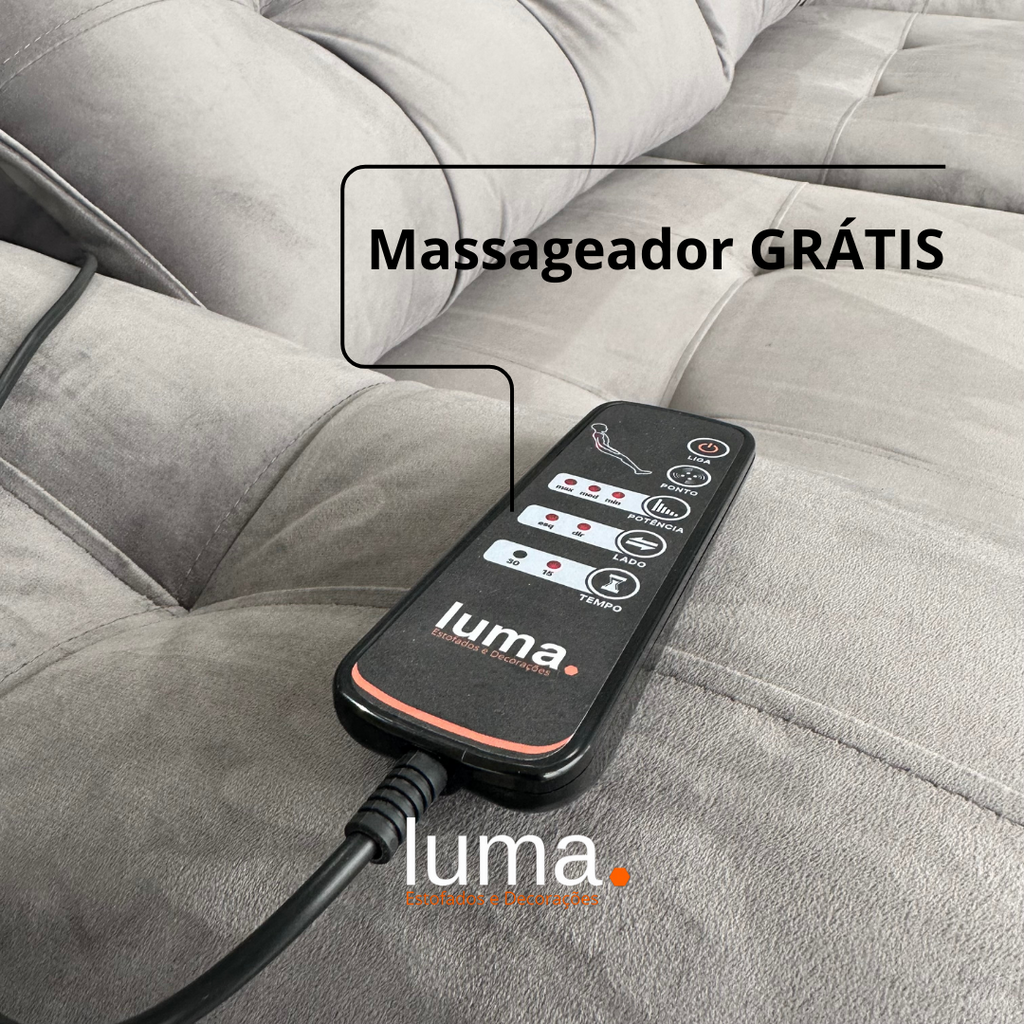 Os assentos contam com espuma D33 certificada, no equilíbrio perfeito entre maciez e suporte. Com generosos 2,90m e uma abertura retrátil de 1,80m, ele se transforma em uma verdadeira chaise para relaxar ou assistir a um filme. E para uma experiência de relaxamento completa, o modelo inclui um massageador exclusivo como cortesia, elevando seu conforto a um novo patamar.
